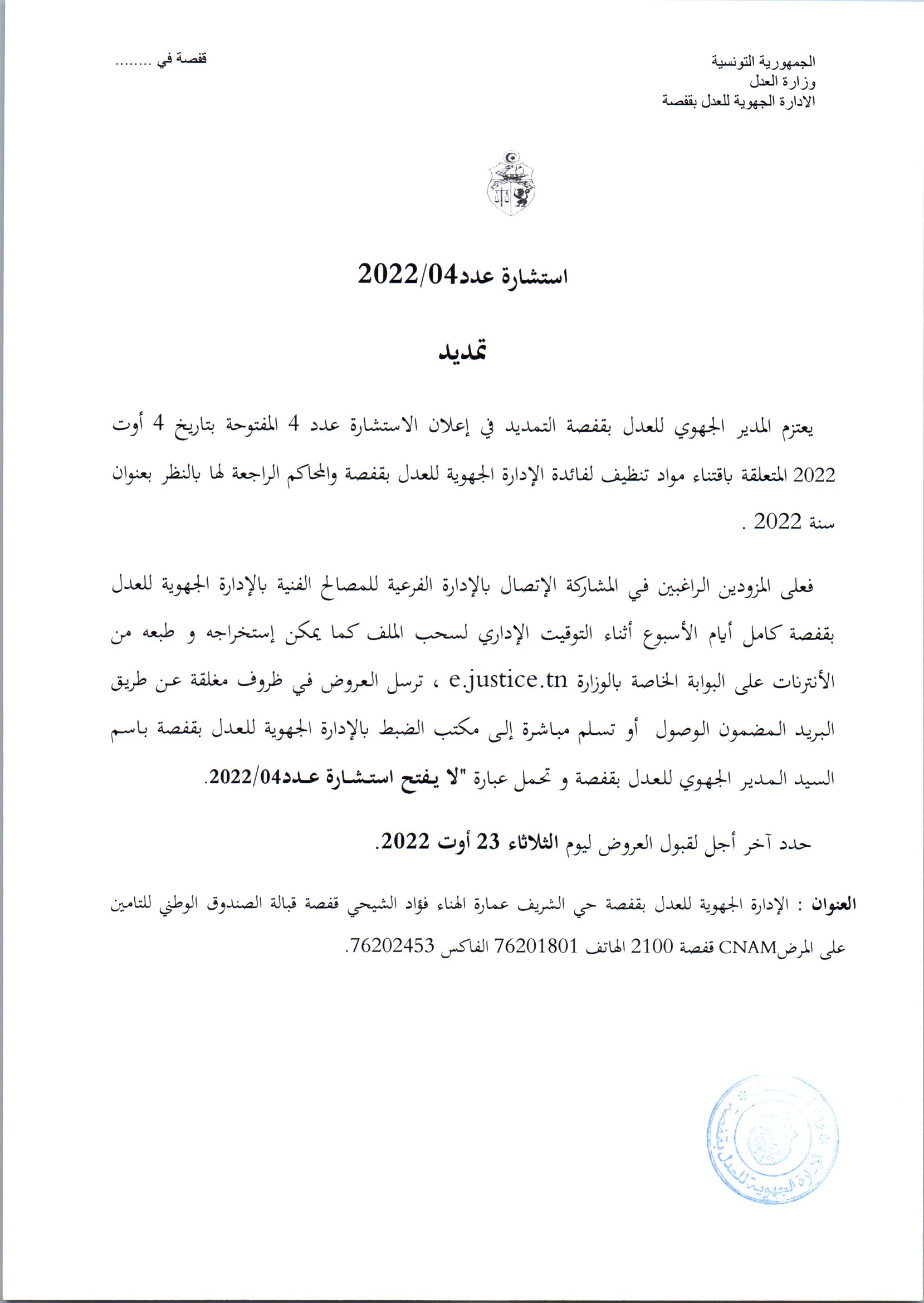 تمديد اجال استشارة عدد 2022/04 الادارة الجهوية للعدل بقفصة
