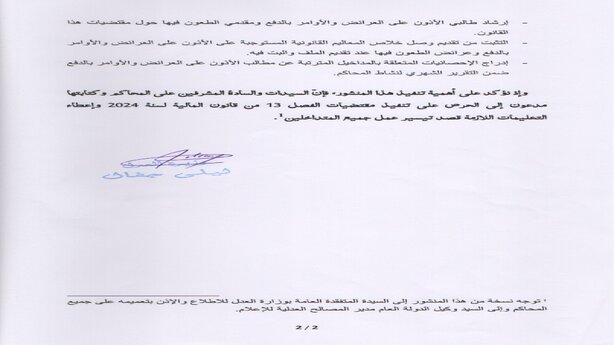منشور السيدة وزيرة العدل حول تفعيل مقتضيات الفصل 13 من قانون المالية لسنة 2024 المتعلق بــ" حساب دعم تطوير المنظومة القضائية العدلية ".