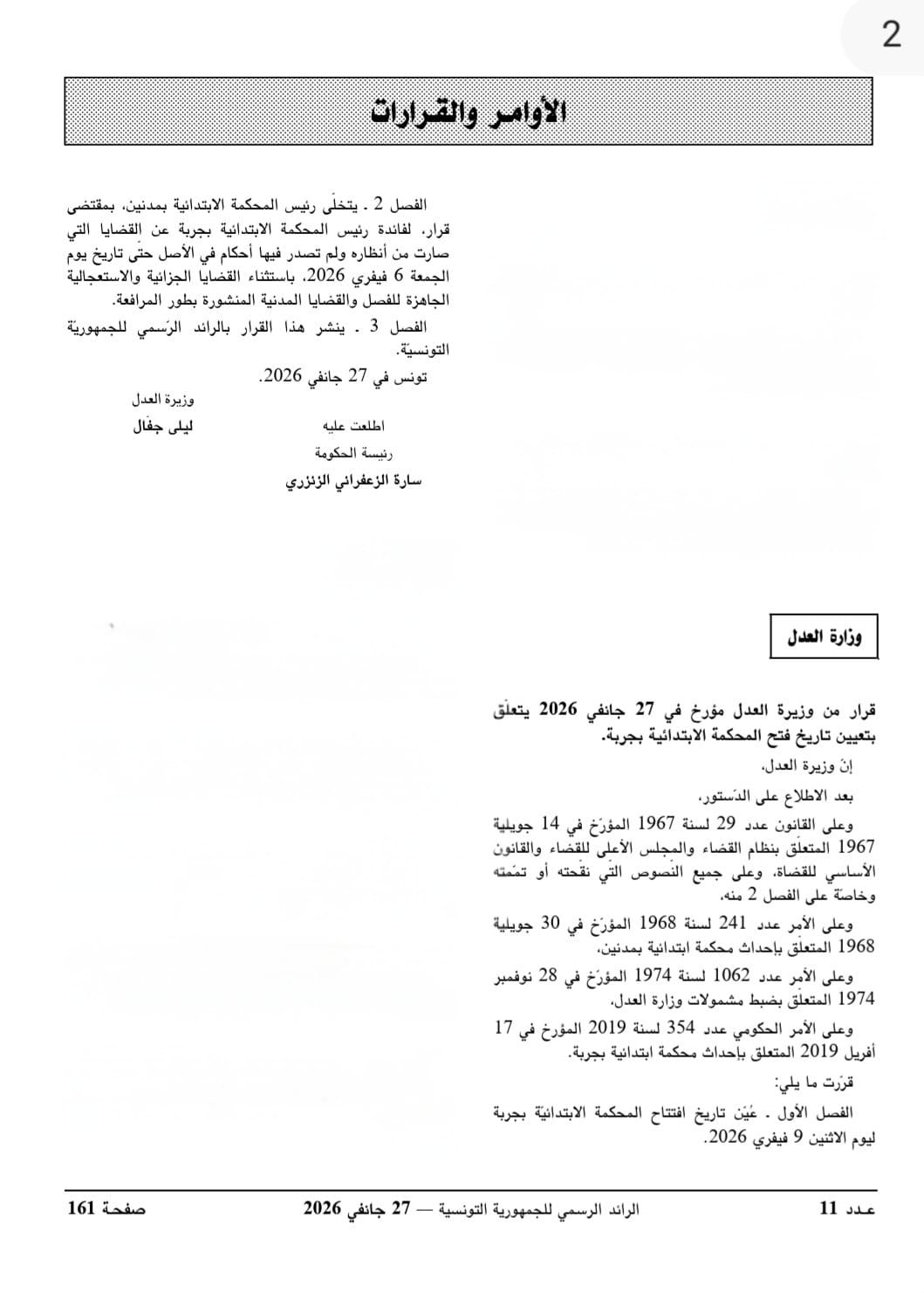 قرار من وزيرة العدل مؤرخ في 27 جانفي 2026 يتعلق بتعيين تاريخ فتح المحكمة الابتدائية بجربة