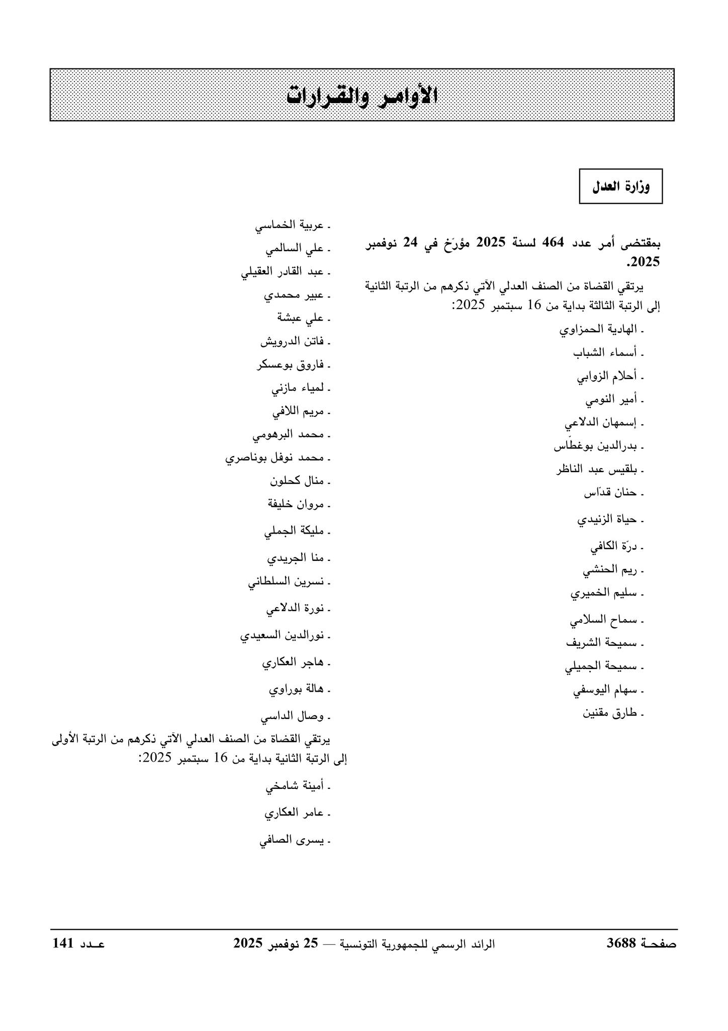 بمقتضى أمر عدد 464 لسنة 2025 مؤرخ في 24 نوفمبر 2025 :ترقية قضاة من الصنف العدلي من الرتبة الثانية الى الرتبة الثالثة.وترقية قضاة من الرتبة الاولى الى الرتبة الثانية.بداية من 16 سبتمبر 2025.