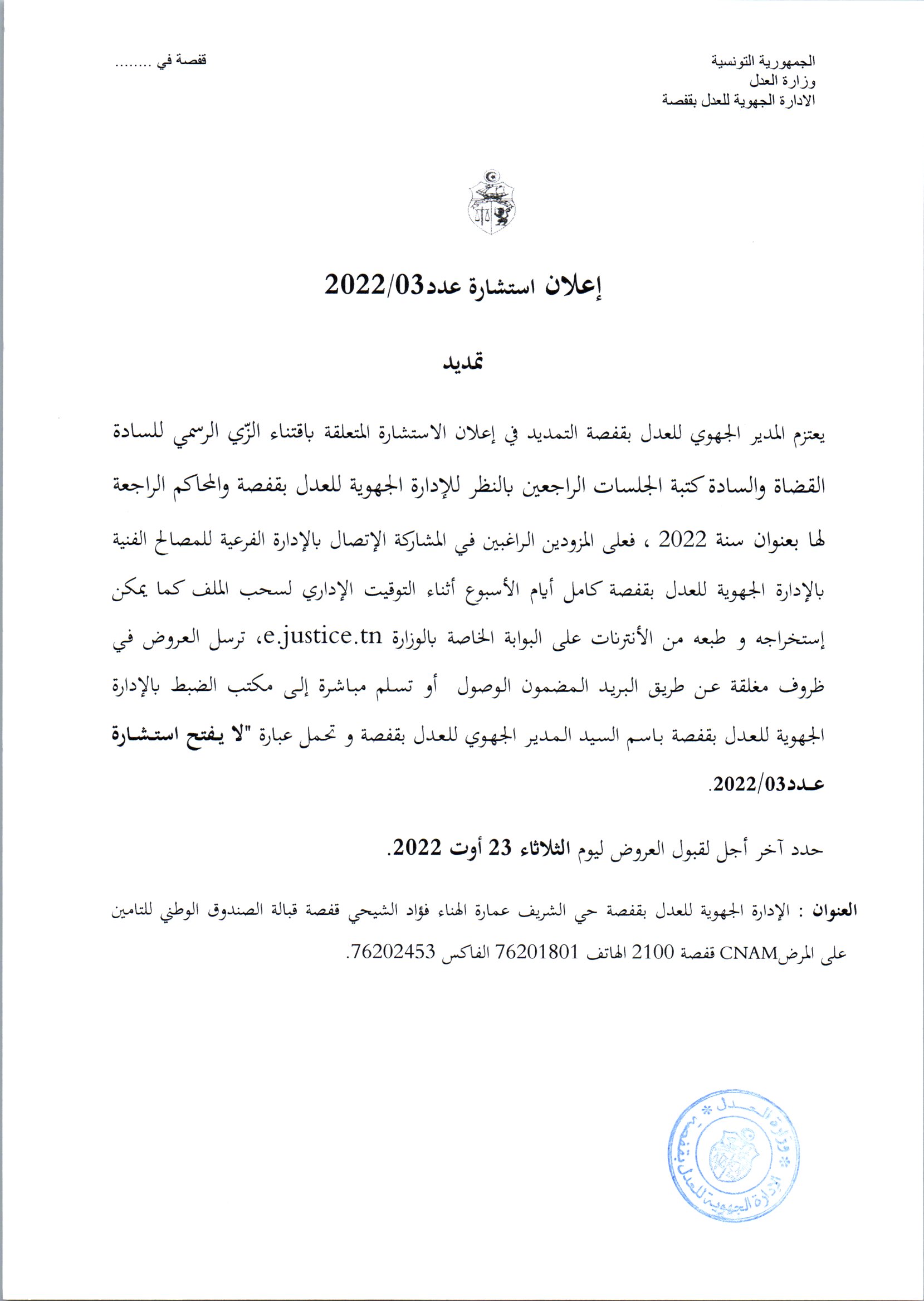 تمديد اجال استشارة عدد 2022/03 الادارة الجهوية للعدل بقفصة