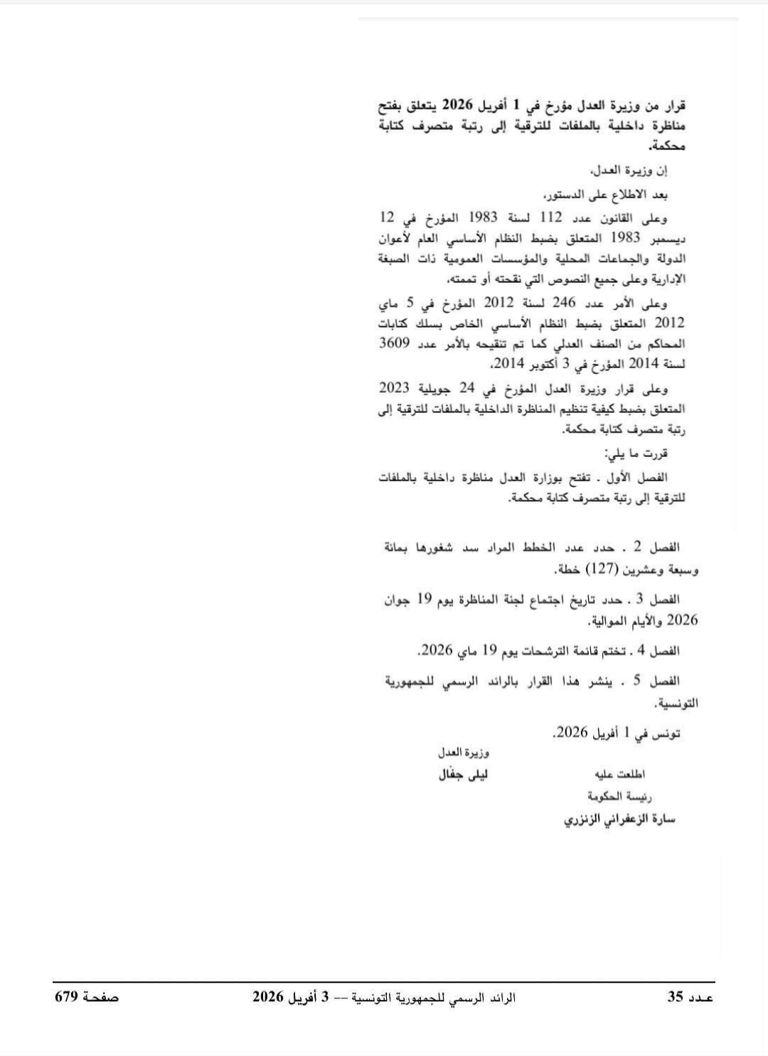 قرار من وزيرة العدل مؤرخ في 01 أفريل 2026 يتعلق بفتح مناظرة داخلية بالملفات للترقية إلى رتبة متصرف كتابة محكمة.