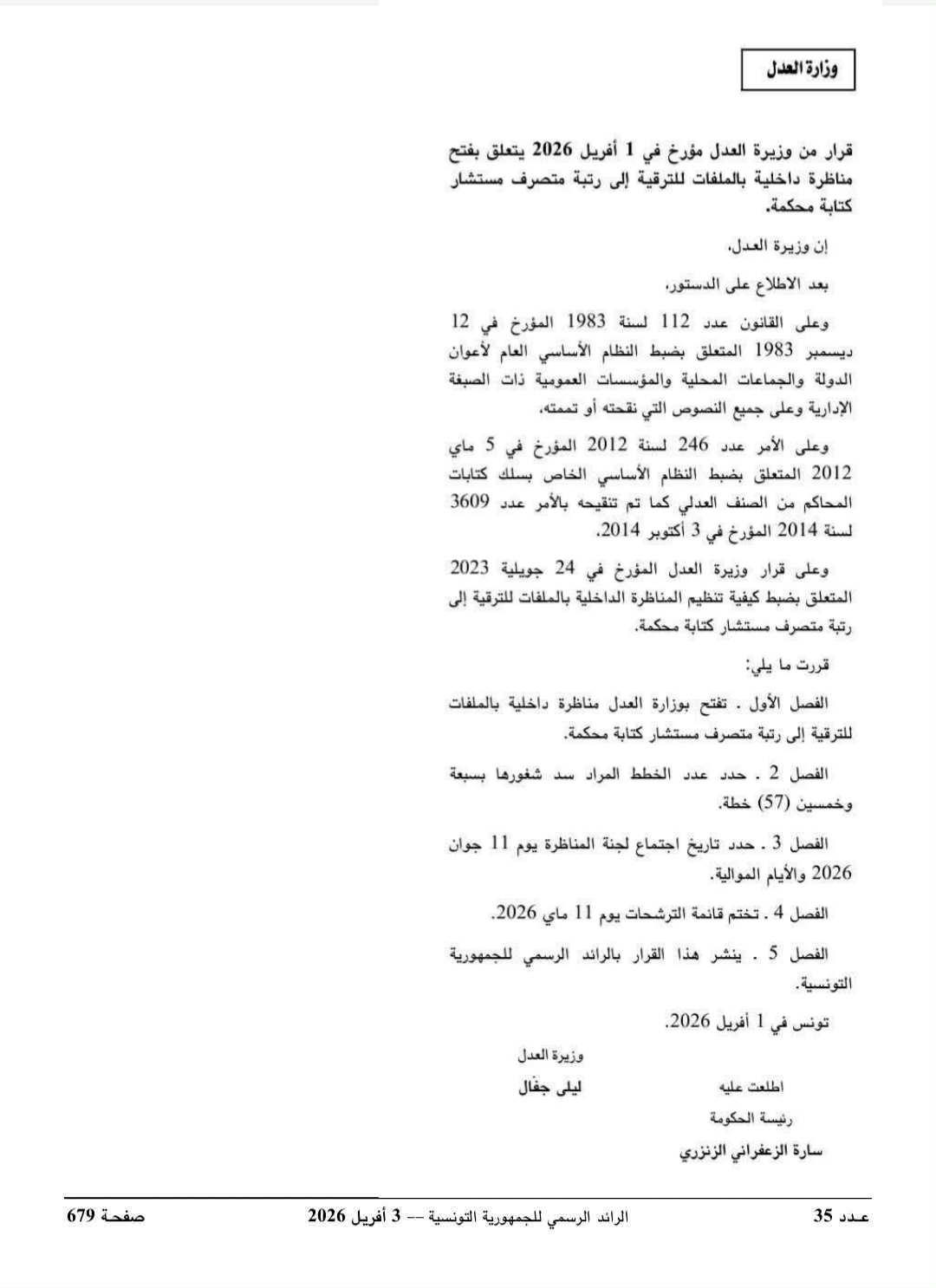 قرار من وزيرة العدل مؤرخ في 01 أفريل 2026 يتعلق بفتح مناظرة داخلية بالملفات للترقية إلى رتبة متصرف مستشار كتابة محكمة.