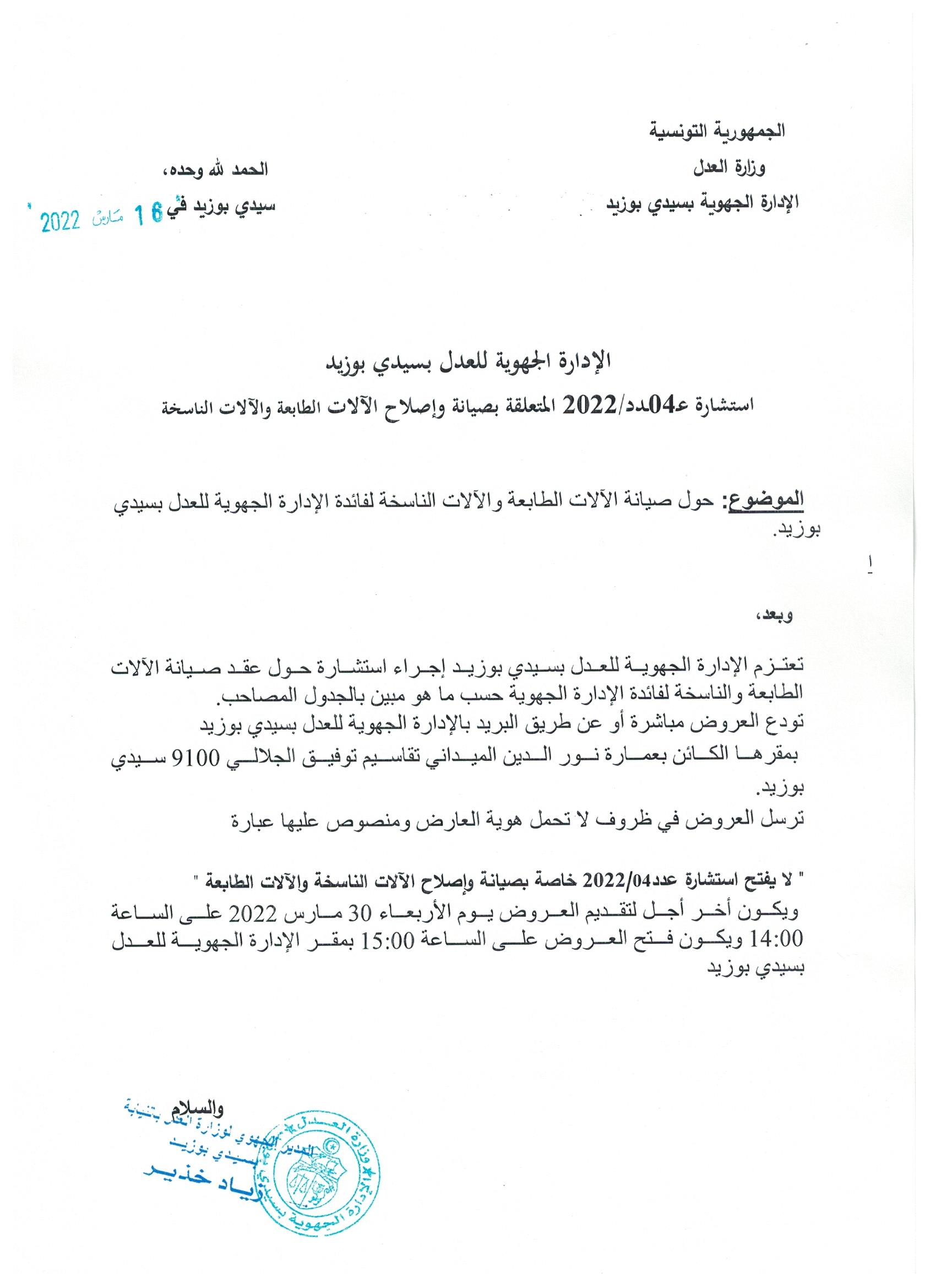 استشارة عدد 2022/04 ( كراس الشروط ) الادارة الجهوية للعدل بسيدي بوزيد